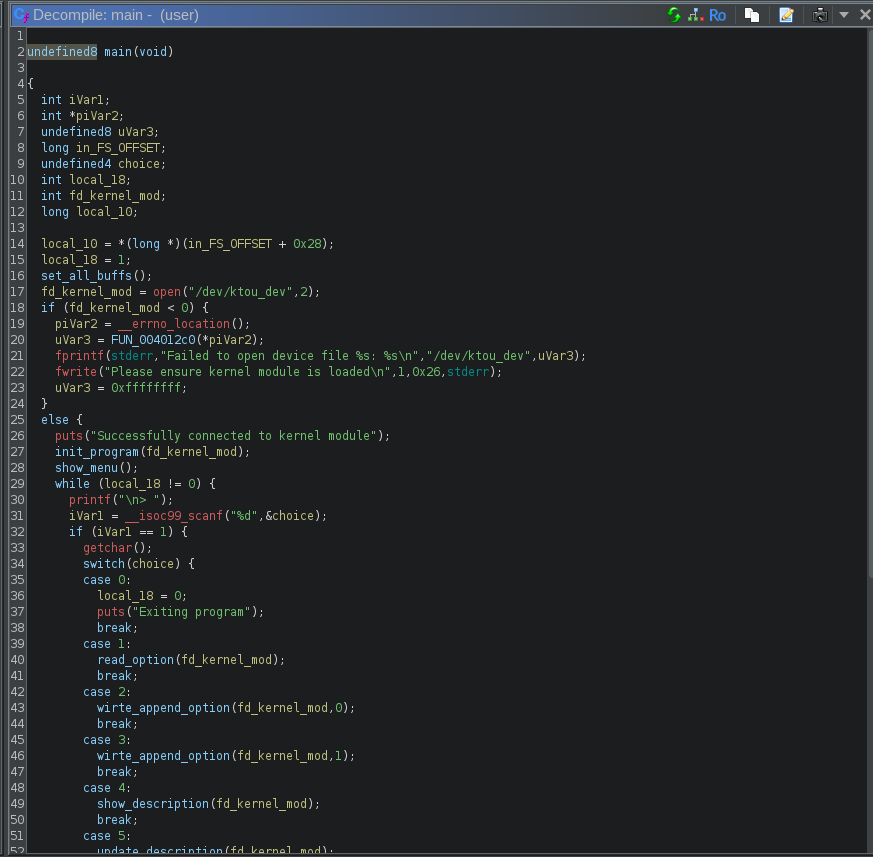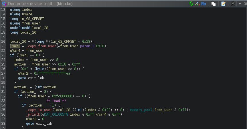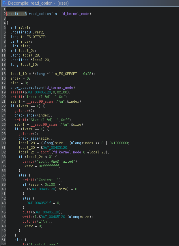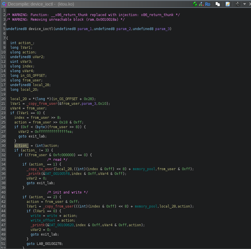 This was the first time I had to deal with a kernel module, but this challenge was not a kernel exploitation challenge, as the module only contains a vulnerability that leads to an exploit in user-space. This is why the flag file is readable by the ctf user. However, I still learned a lot about how kernel modules work and how user programs can interact with them.